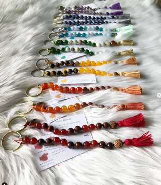 A Mala Keychain is a ‘Mini Mala’ consisting of 12 beads, 1 Guru bead & tassle. The number 12 represents the 12 zodiac signs and the 12 Houses in astrology.