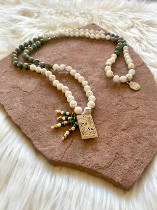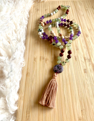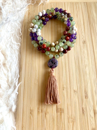 Malas necklaces are hand-tied with 108 gemstone beads, a Guru bead, and a decorative tassle. Each design is one-of-a-kind and completley unique.