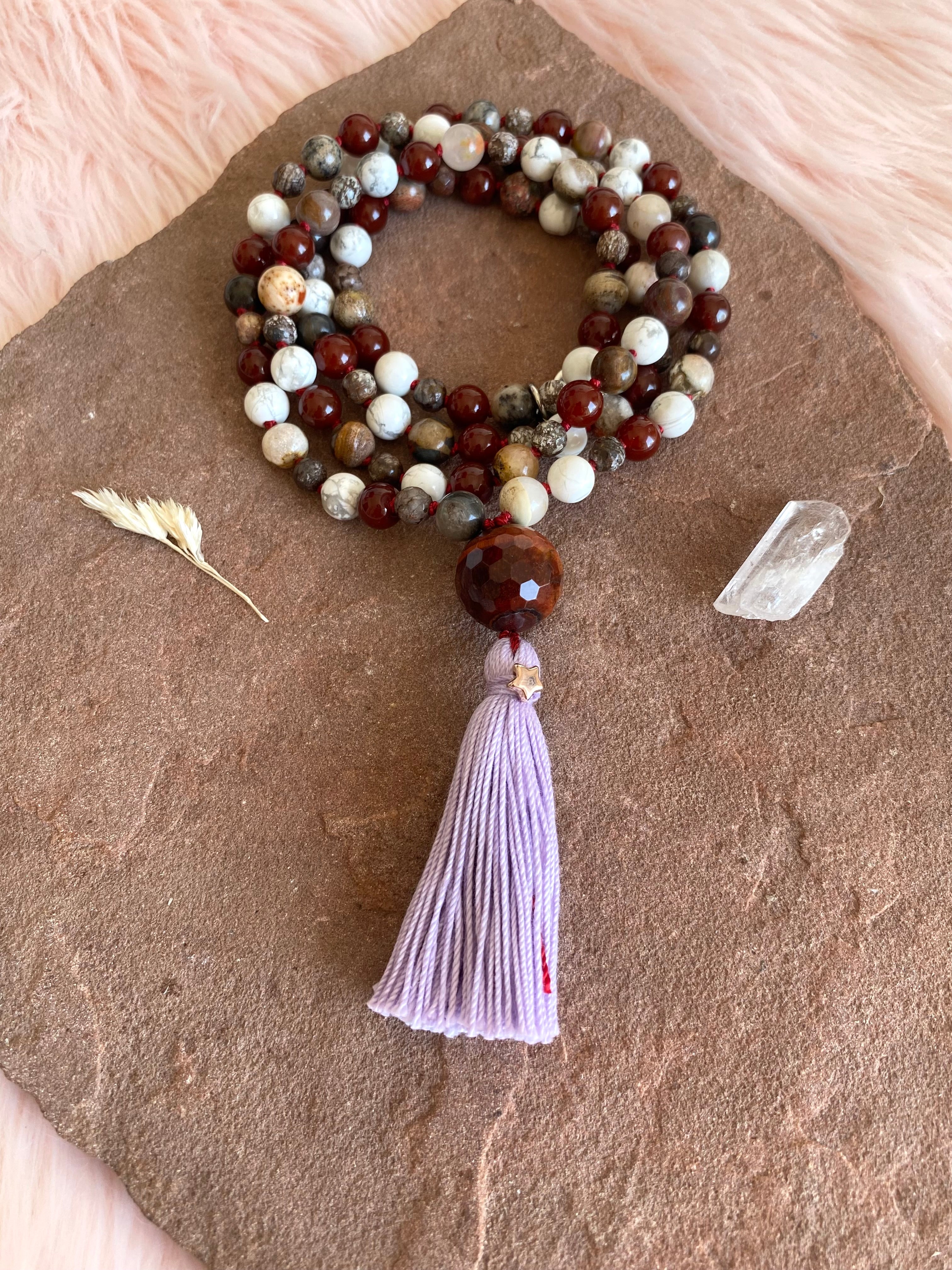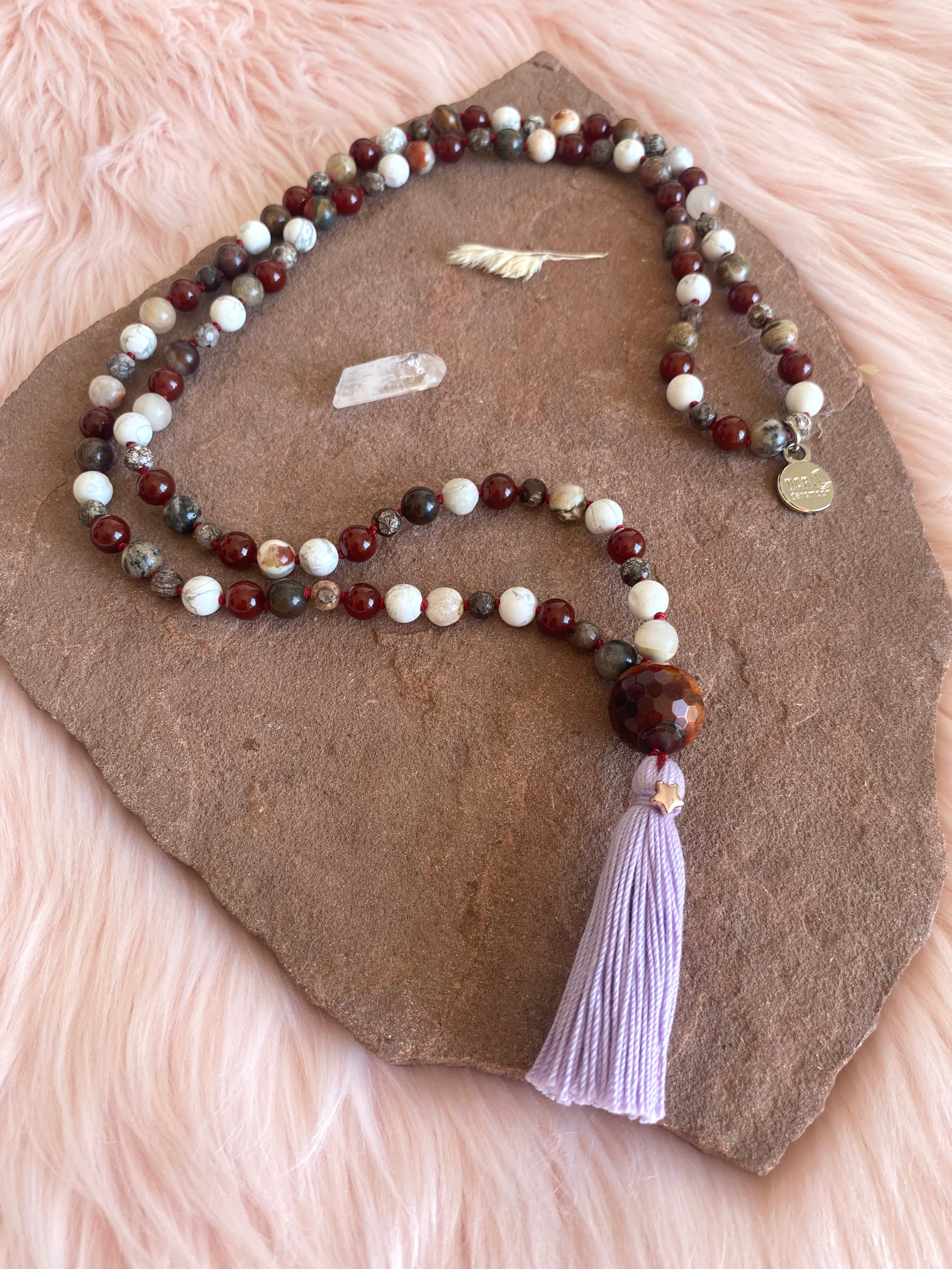 The Root and Shine Mala was created to keep you grounded, steady and shining in your own energy. The red and white stones bring a balance of strength and calm. Rooting you into the Earth while inviting clarity, peace and awareness.