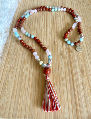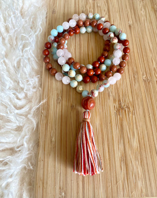 Malas necklaces are hand-tied with 108 gemstone beads, a Guru bead, and a decorative tassle. Each design is one-of-a-kind and completley unique.