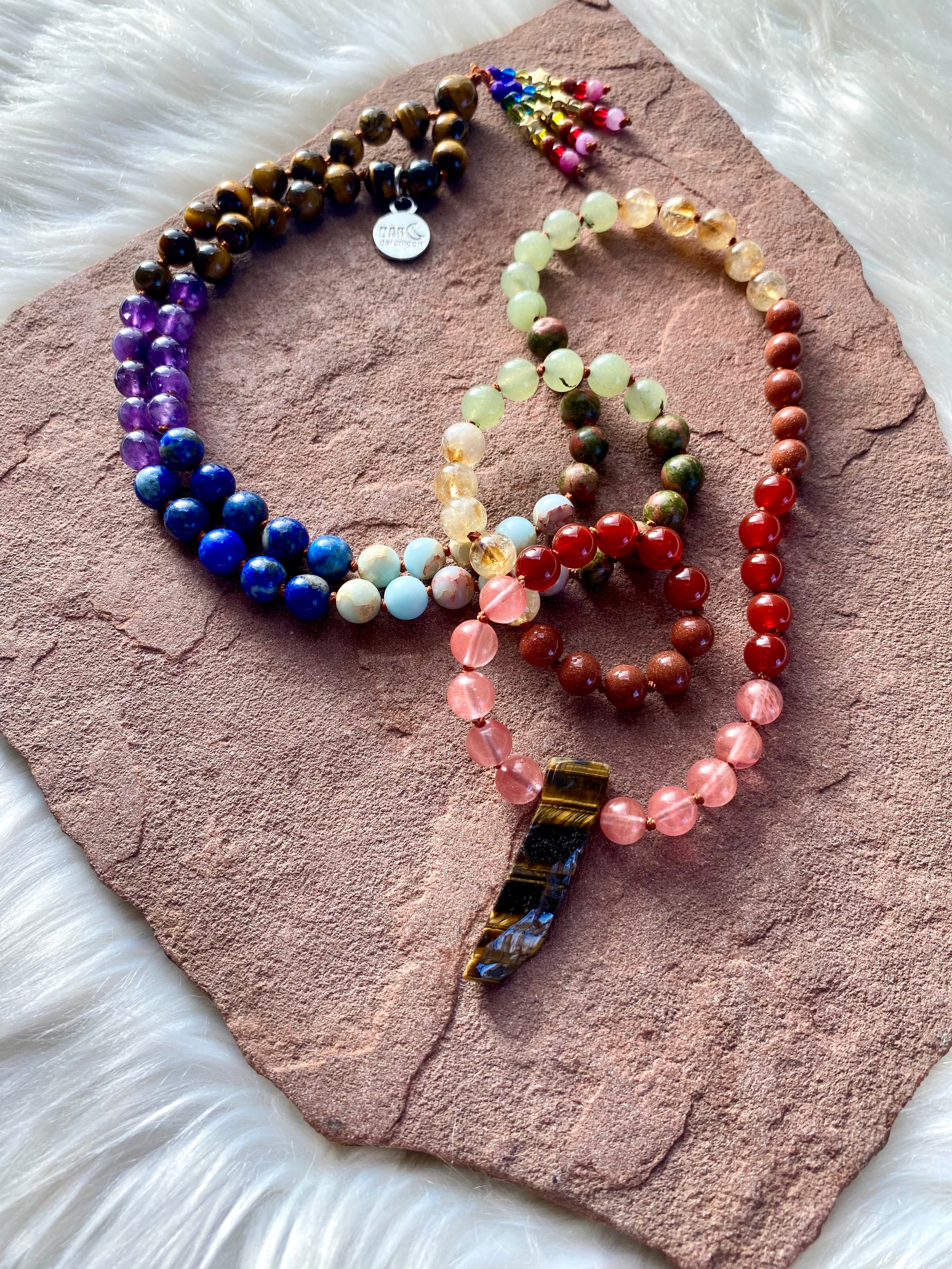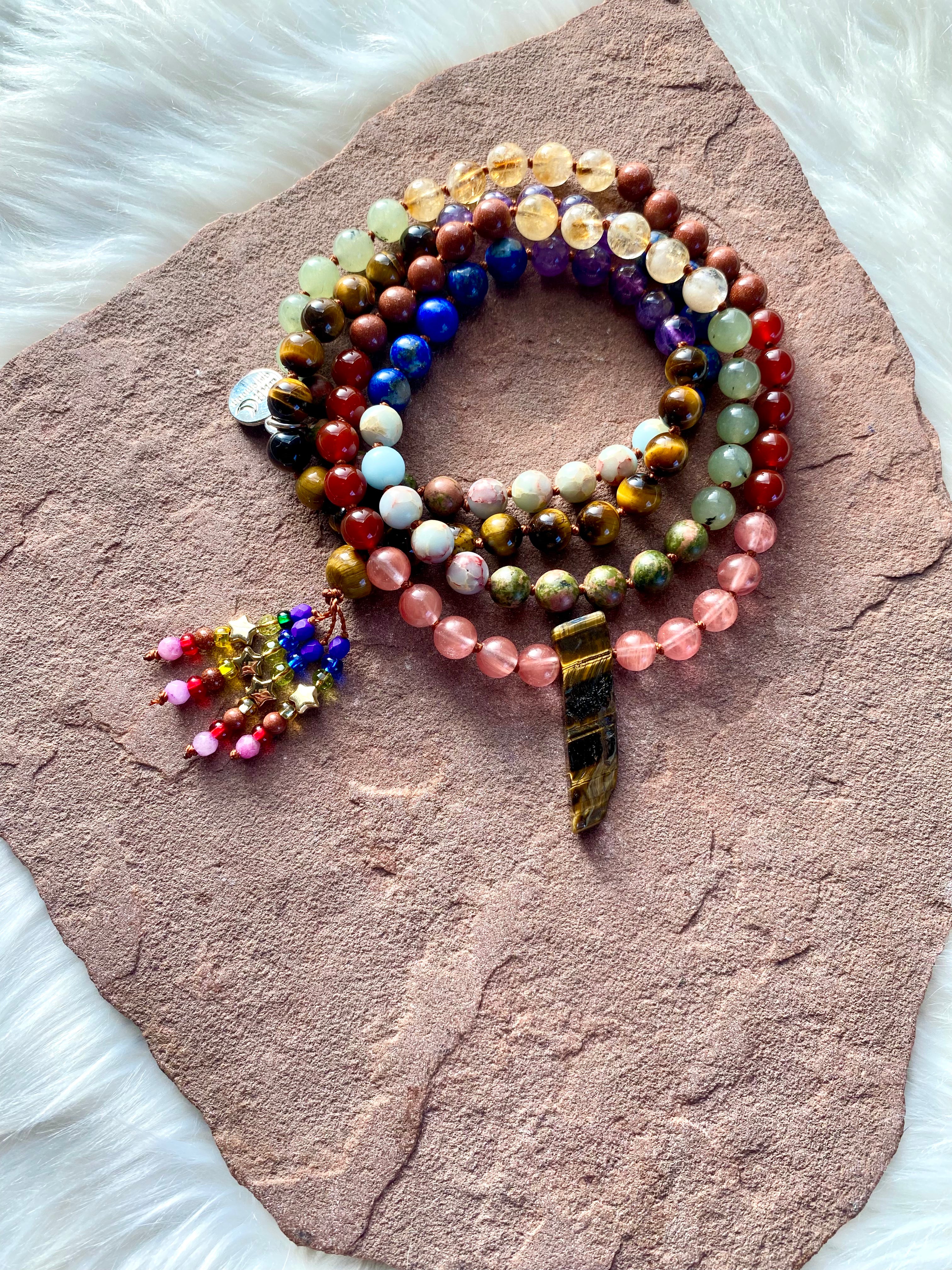 The Earthbound Rainbow Guardian Mala radiates vibrant, uplifting energy that balances and activates the chakras, supporting a flow of vitality from root to crown. Its rainbow hues bring joy, creativity, and clarity, while the rich brown tones of the central pendant provide grounding, protection, and focus. Playful star accents add a spark of wonder, reminding you to stay open to possibility and higher inspiration.