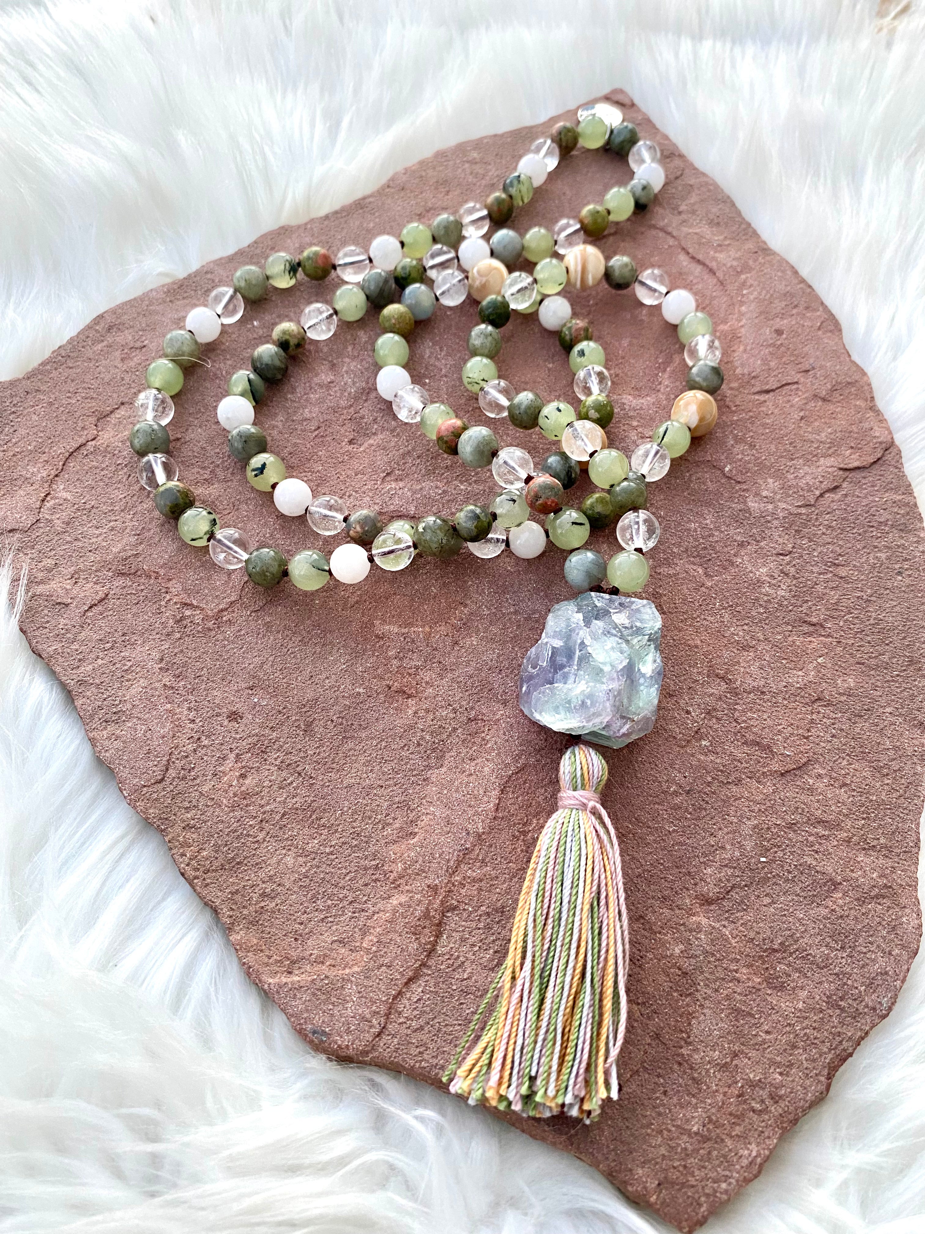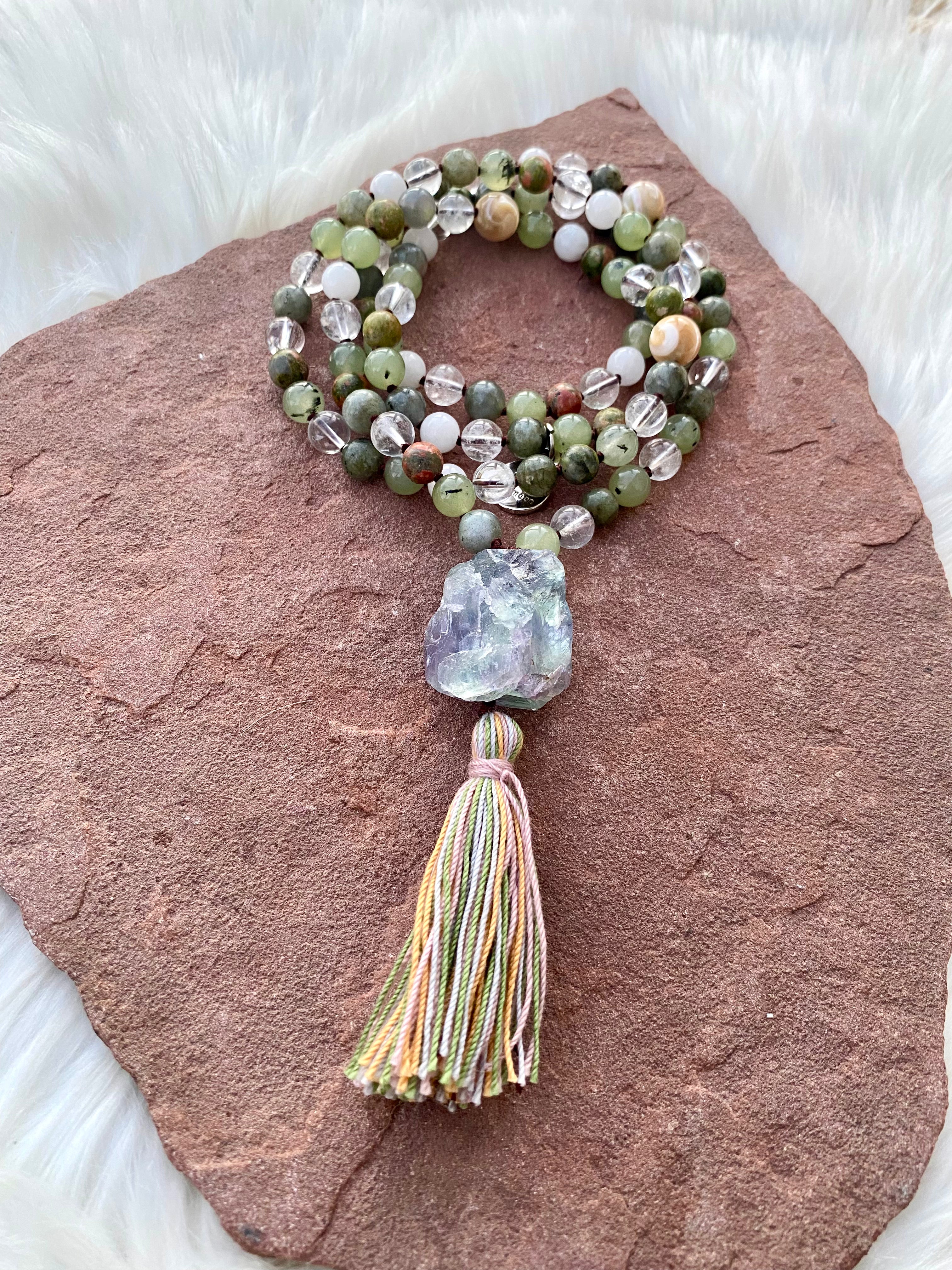 At the center, the raw fluorite guru bead acts as a stabilizing force, offering protection while amplifying your intentions. The surrounding beads work together to encourage emotional balance, spiritual clarity, and gentle rejuvenation. Whether worn during meditation, reflection, or daily life, this mala is a reminder to honor your inner growth, trust the natural flow of your path, and embrace each new beginning with confidence.
