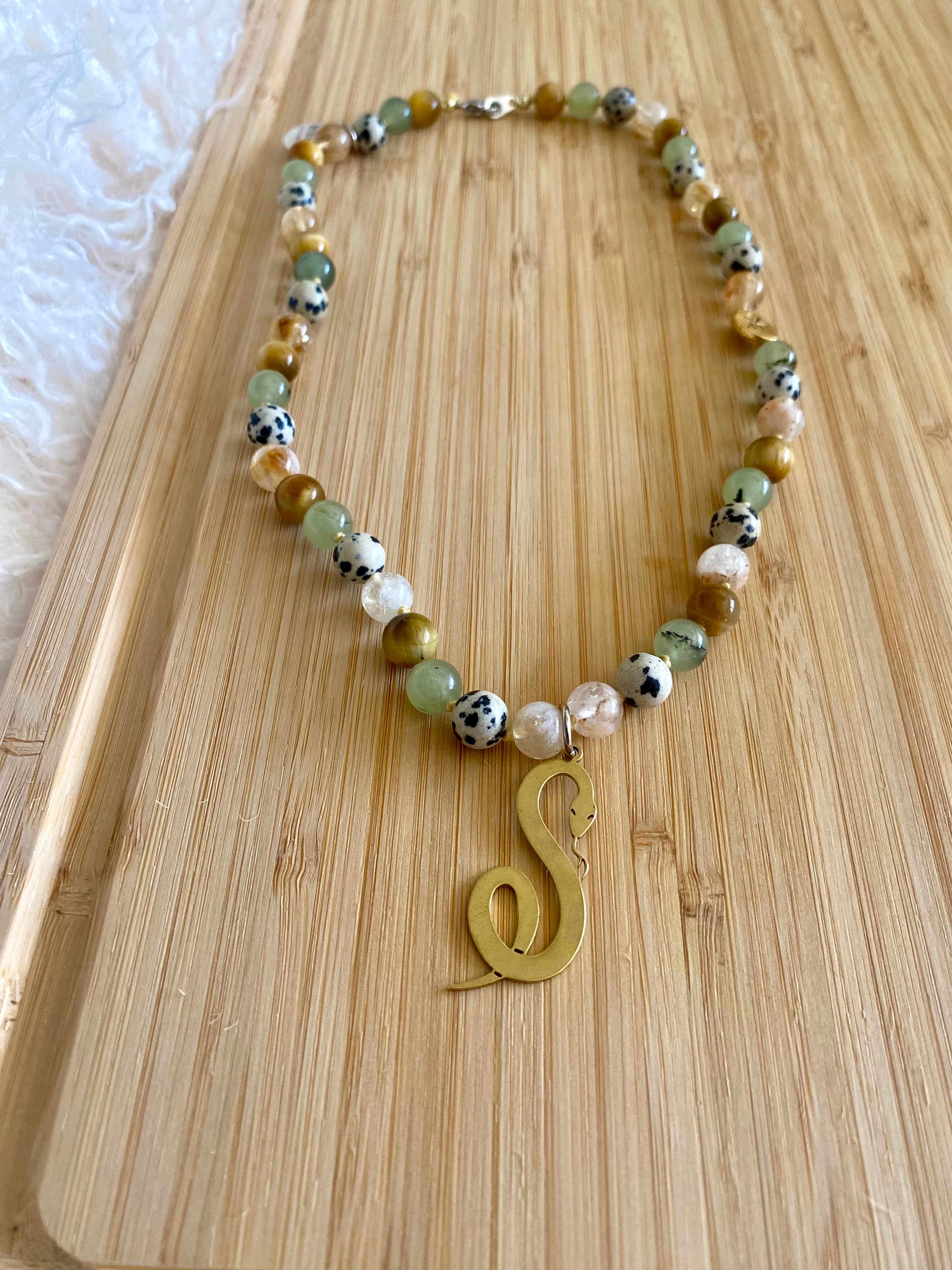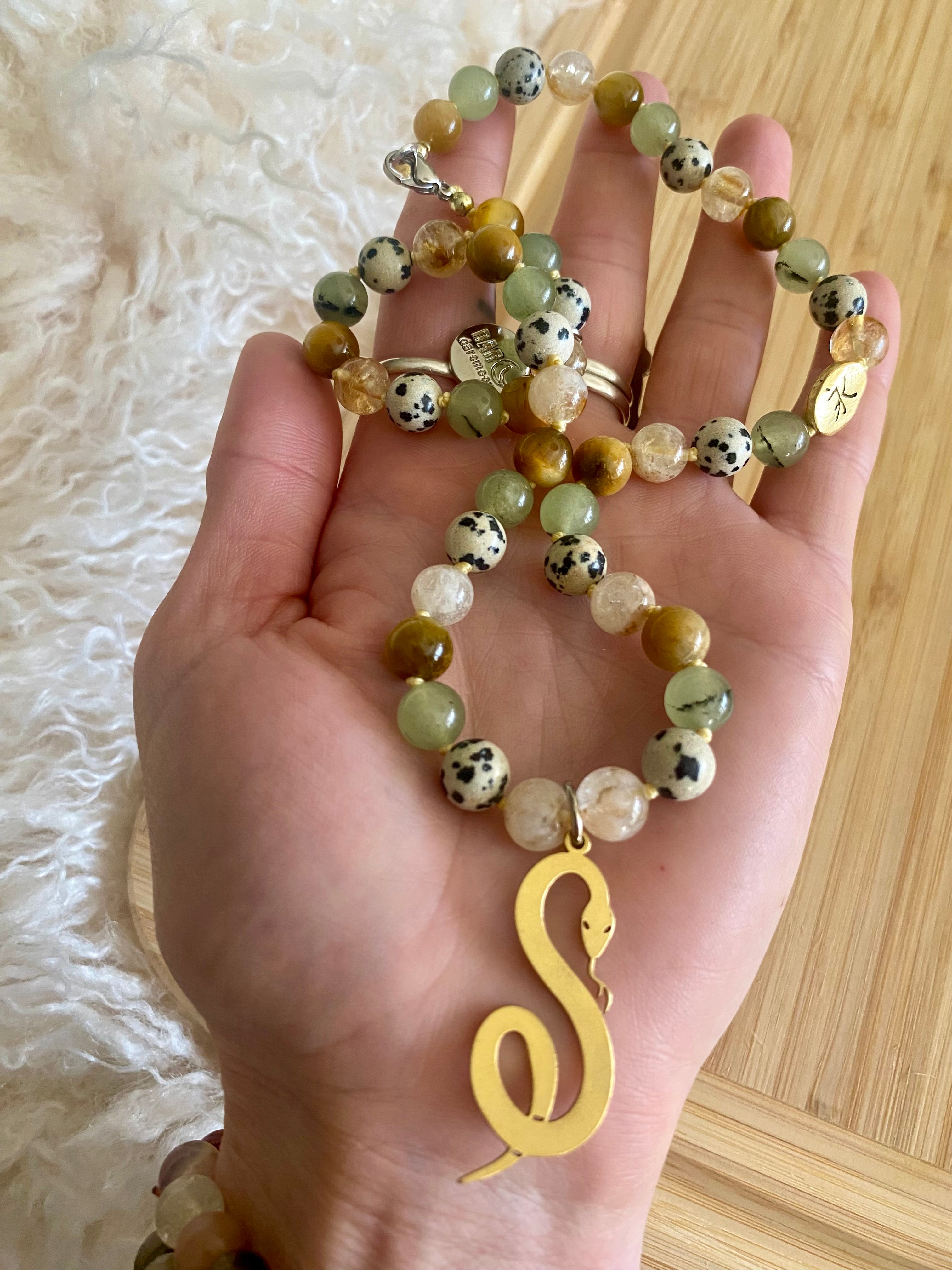 The Everlasting Golden Serpent Short Necklace is a grounded sunshine talisman of self confidence, joy, and divine strength. Its warm golden hues inspire ambition, confidence, and creativity. The grounding greens connect to the Heart Charka. The golden serpent symbol embodies wisdom, resilience and inner strength.