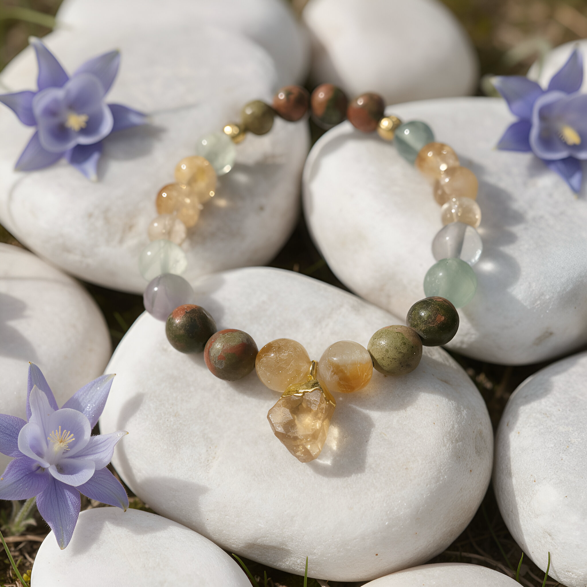 Fluorite — A protective stone that cleanses and stabilizes the aura, drawing off negative energies and supporting clarity of mind and emotion. Fluorite encourages progress, structure, and balance, helping the wearer move through challenges with focus and calm.